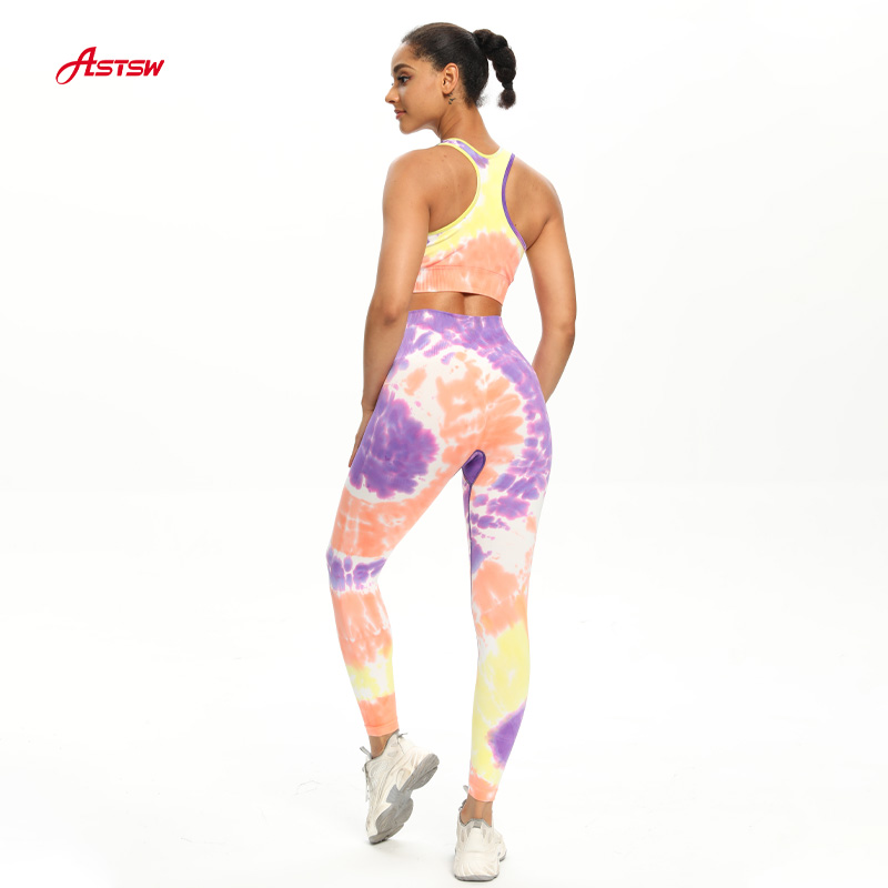 シームレスなスポーツウェアコレクション.このシームレスでインパクトのあるレーサーバックブラトップとヒットリフティングレギンス カラフル 絞り染めのパターン.